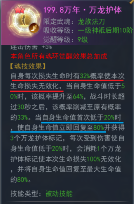 从实际的战斗来说,使用金神赐的双增幅效果依旧不错,问题出在坦度上,不合体的法刀是可以被选中的近战武魂,有相当的生存压力,但搭配【万龙护体】后,生存是有保障的,暴毙的概率不高。